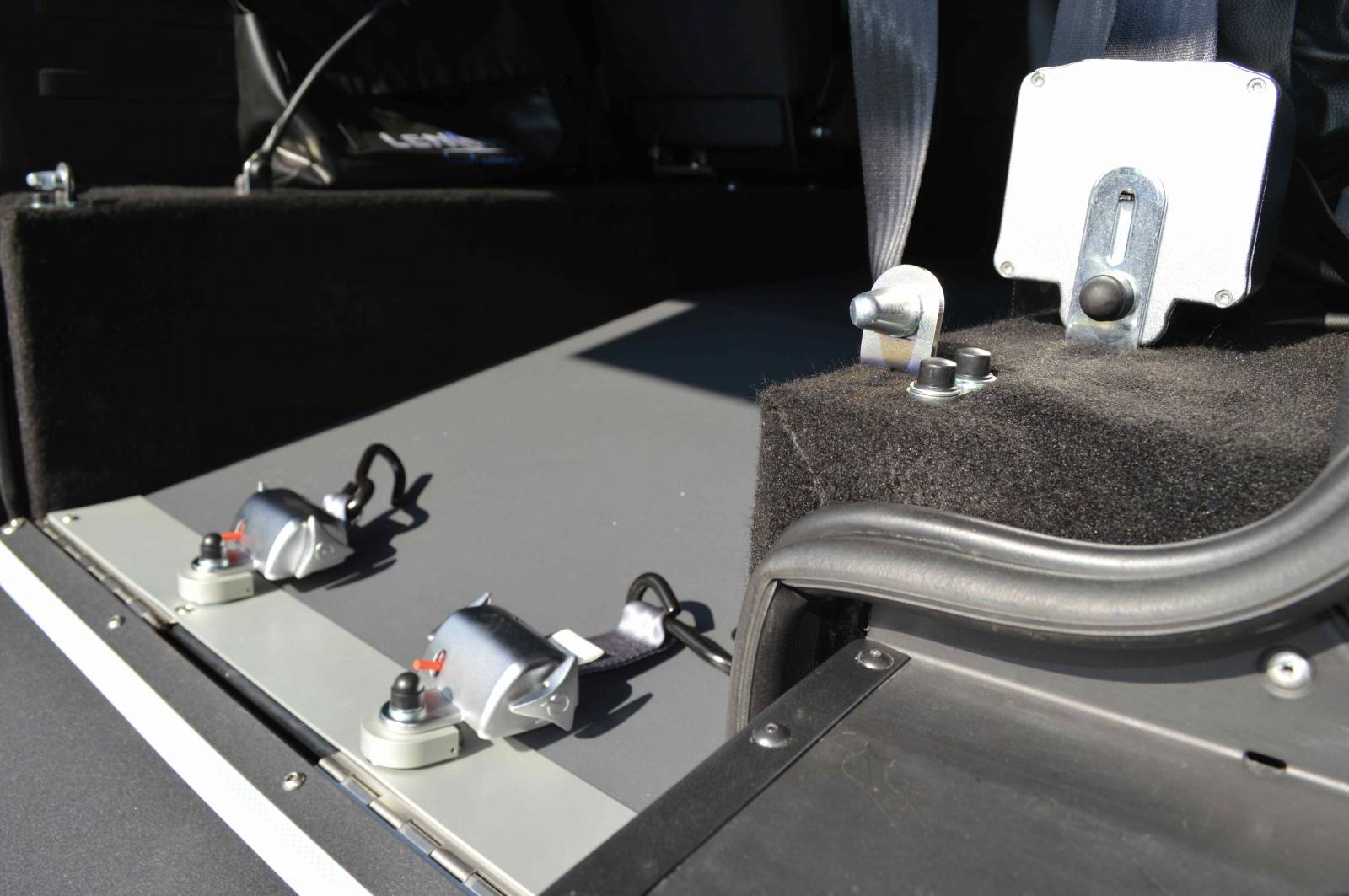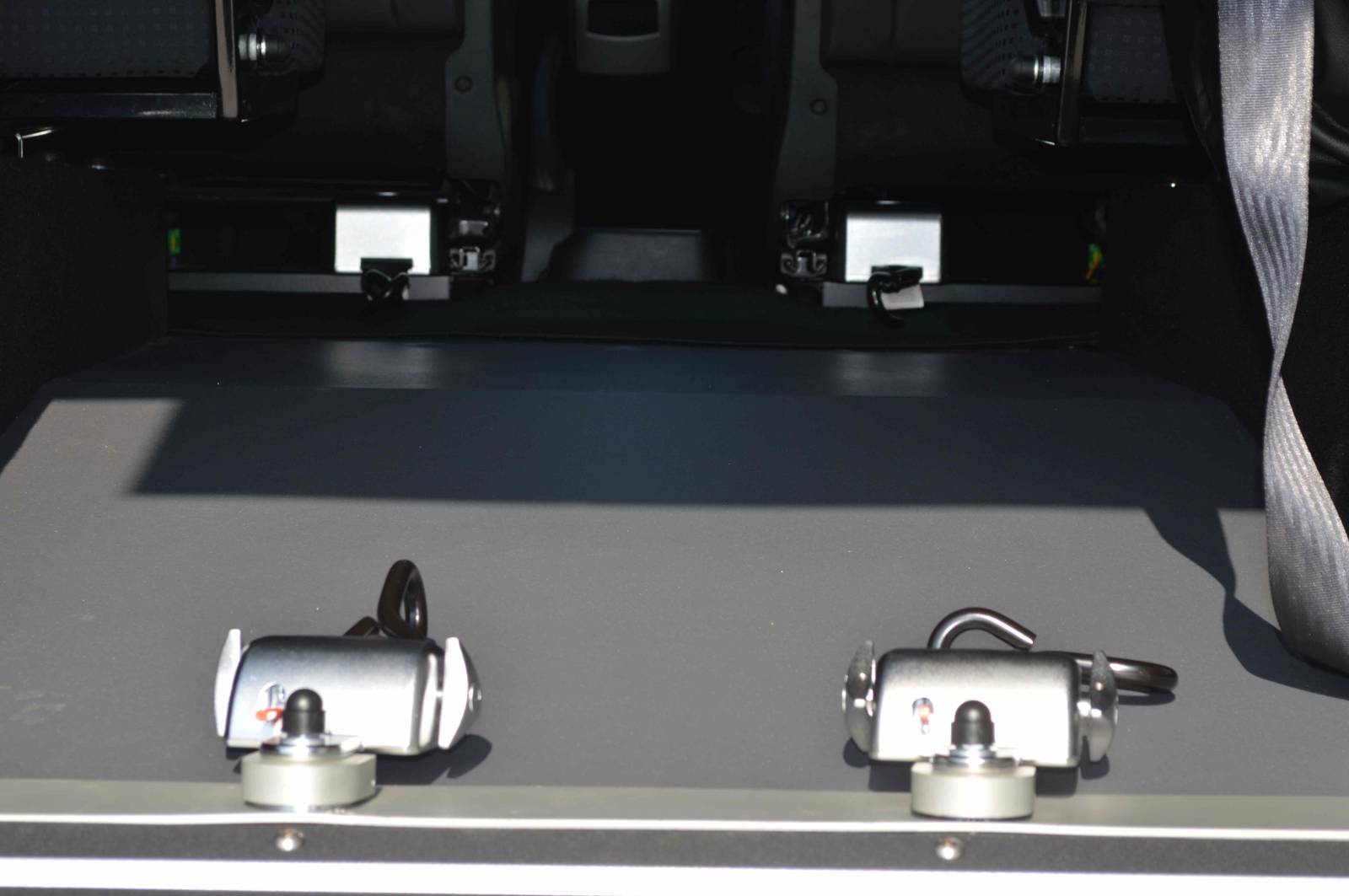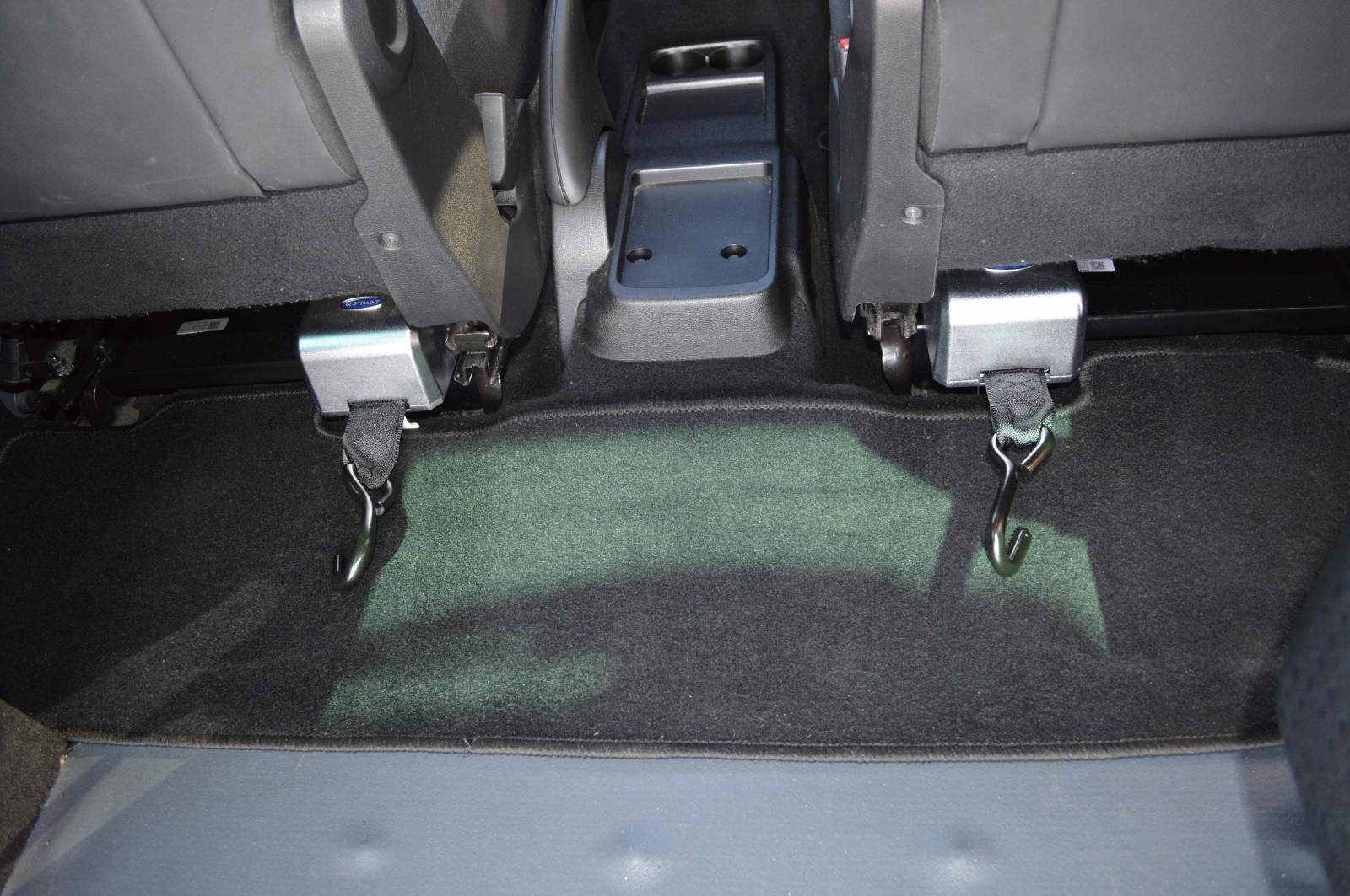 Fixation 4 points avec enrouleurs électriques pour chaise roulante et ceinture de sécurité ventrale.