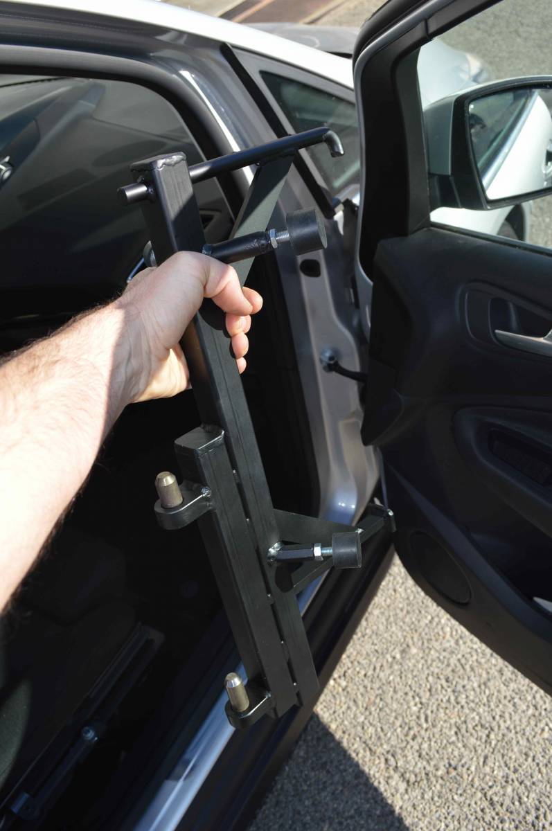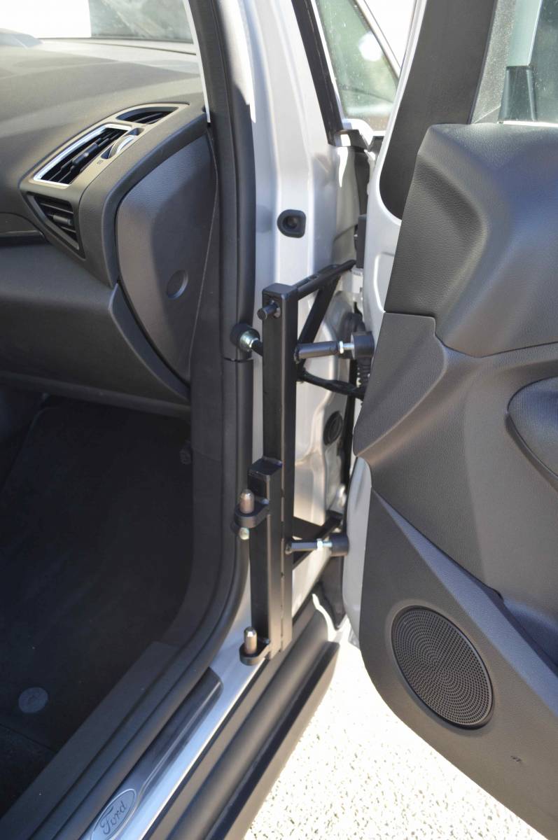 – d’un support fixé au plancher du véhicule, ou en version amovible, qui se pose sur es charnières de la porte du véhicule.