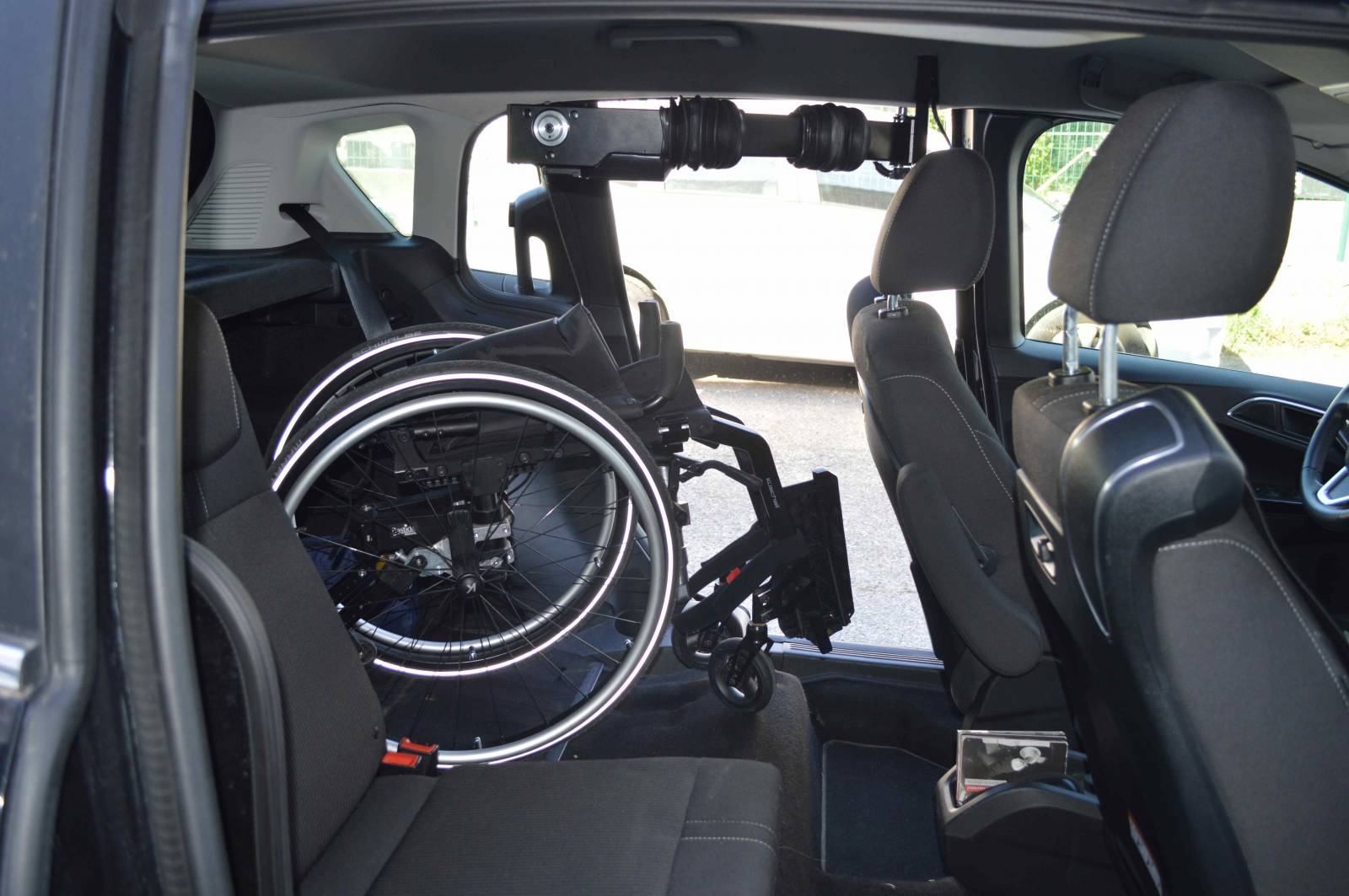 Treuil motorisé sur bras articulé, il permet de charger le fauteuil roulant manuel ou à propulsion électrique, replié ou pas(selon situation) à l'intérieur véhicule. A noter que, dans les véhicules cinq portes, il est très souvent nécessaire d’installer, en complément, une porte arrière escamotable pour créer l’espace satisfaisant au passage du fauteuil roulant.