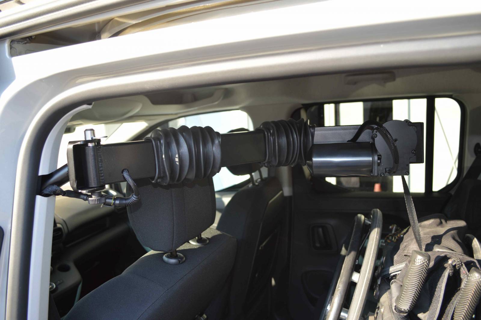 Fixé sur la partie supérieure du montant de la voiture, le bras articulé peut être démonté de son support en quelques secondes.