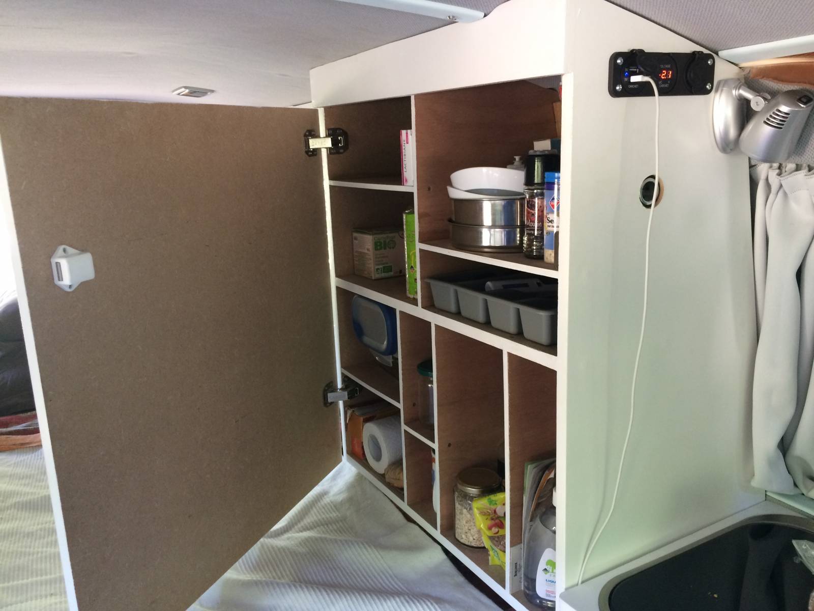 - 1 meuble-placard / tableau électrique, usb et voltmètre / prise 12v allume cigare / épicerie et popote/ 1 spot kitchenette Led 12v-2w